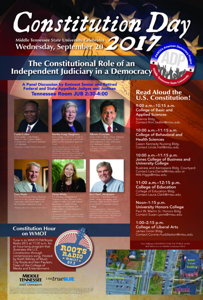 The Constitutional Role of an Independent Judiciary in a Democracy, Wednesday, September 20, 2017 – Tennessee Room, James Union Building – 2:30 pm. Panel with distinguished Senior judges, retired judges, and justices.