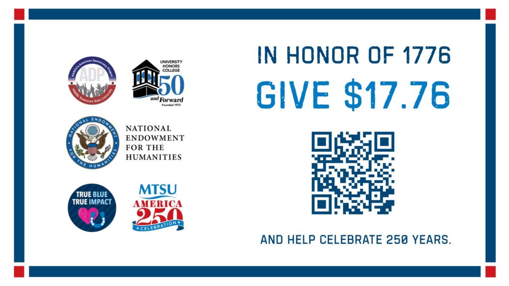 As we prepare for America’s 250th anniversary, the MTSU Honors College and the American Democracy Project have received a $25,000 National Endowment for the Humanities grant for “Celebrating America.” To unlock these funds, we must meet the required match.